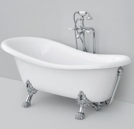 Partiamo proprio dalla vasca freestanding in ceramica bianca, con accessori cromati e piedini a zampa di leone, davvero caratteristici. La colonnina dei rubinetti esterna e il tubo di scarica a vista completano il design.