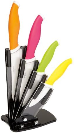 Si tratta di un ceppo di coltelli in ceramica molto colorato, che contiene quattro elementi dalle diverse lame, caratterizzati da impugnature in gomma antiscivolo molto resistenti.
