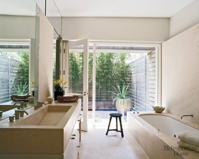 La camera padronale si affaccia a est per usufruire della luce mattutina mentre il bagno en suite è rivestito di pietra color beige e ha un cortile privato su cui affacciarsi: è un insolito modo per evitare di applicare le tende alle stanze più private!