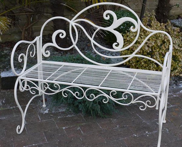 Per chi ha un animo sognatore, ecco una panchina in metallo unica nel suo genere. Le due decorazioni sono talmente fini che sembra quasi una panchina realizzata in pizzo.